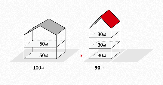 土地の面積をカットしても、3階建てにすることで2階建てと変わらない延べ床面積を確保することができます。狭小地に家を建てるノウハウと高い技術力が、狭小地の3階建てを可能にしています。