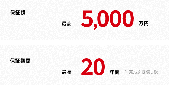 地盤に関しては、大手地盤保証会社である、ジャパンホームシールド株式会社(JHS)にて保証判定を実施しています。万が一の地盤沈下による建物の損害が発生した場合には、最高5,000万円、最長20年間の保証が付いているので安心です。
