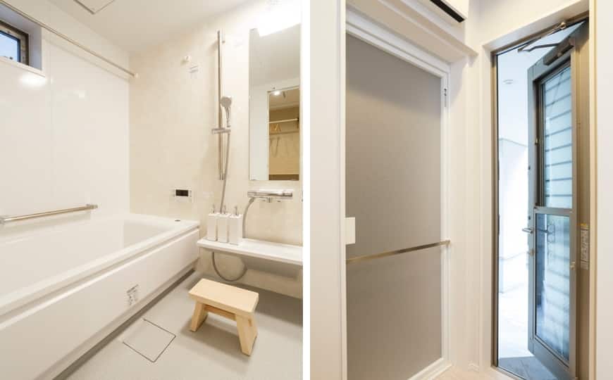 駐車場の奥の勝手口。荷物の出し入れはもちろん、湿気がこもりがちな洗面所の換気もできます。
