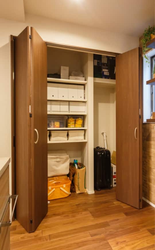 パントリーのように食材のストックや、趣味の登山グッズなどを入れたりと、多用途な大容量の収納を完備。