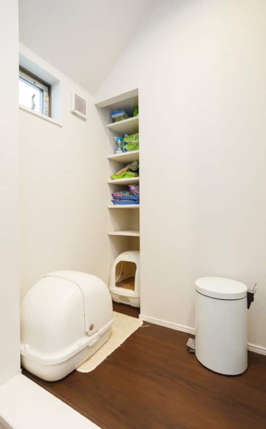 居室の一部を猫コーナーにアレンジ。トイレやグッズがぴったり収まる便利なスペースになりました。