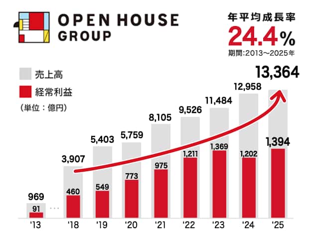 オープンハウスは2013年9月の東証一部上場以来、年平均成長率24.4%という高い水準で成長を続けています。2023年には売上高一兆円を突破しました。
