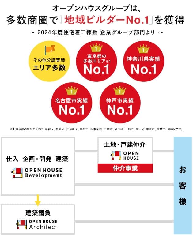 オープンハウスグループは、「2024年度住宅着工棟数 企業グループ部門」より東京都の多数エリアにてNo.1(※1)、神奈川県No.1、名古屋市No.1、神戸市No.1を獲得しました。