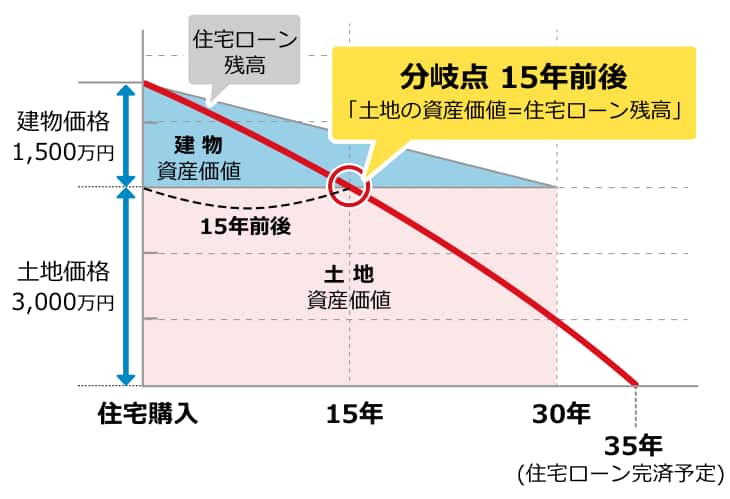 都心の場合、15年目を分岐点とし、徐々に住宅ローンが土地の資産を下回っていくため、土地の価値だけで住宅ローンを返済できます。