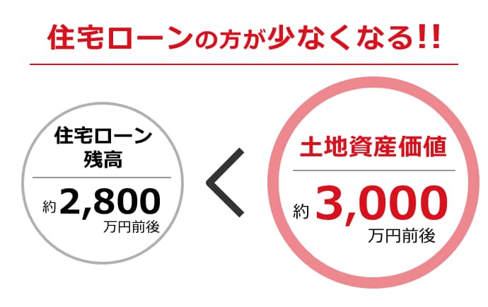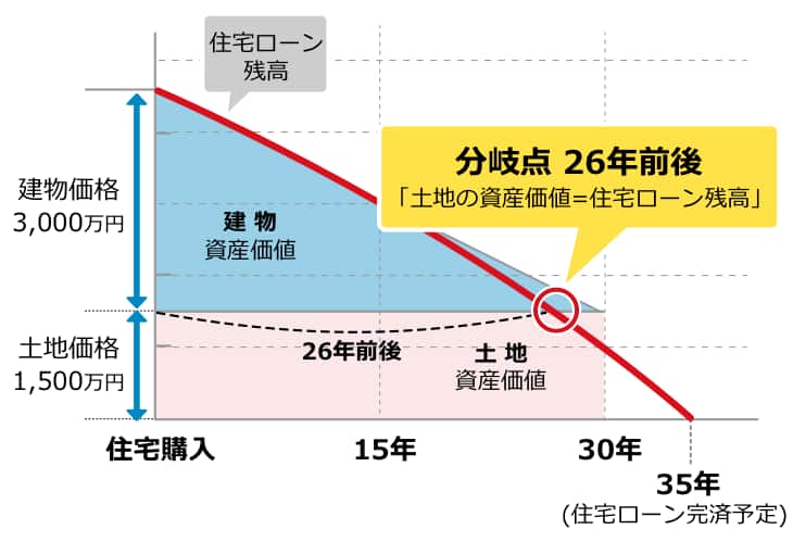 家を購入する際に、多くの人が「住宅ローン」を活用されますが、「最長35年も払い続けられのか?」と不安をお持ちの方もいるかもしれません。しかし、家を売却したときの資金で住宅ローンを完済できれば、その後の支払いはなくなります。そこで、土地の資産価値=「住宅ローン残高」となる時期、つまりローンの心配がなくなる「分岐点」がどこか考えてみましょう。