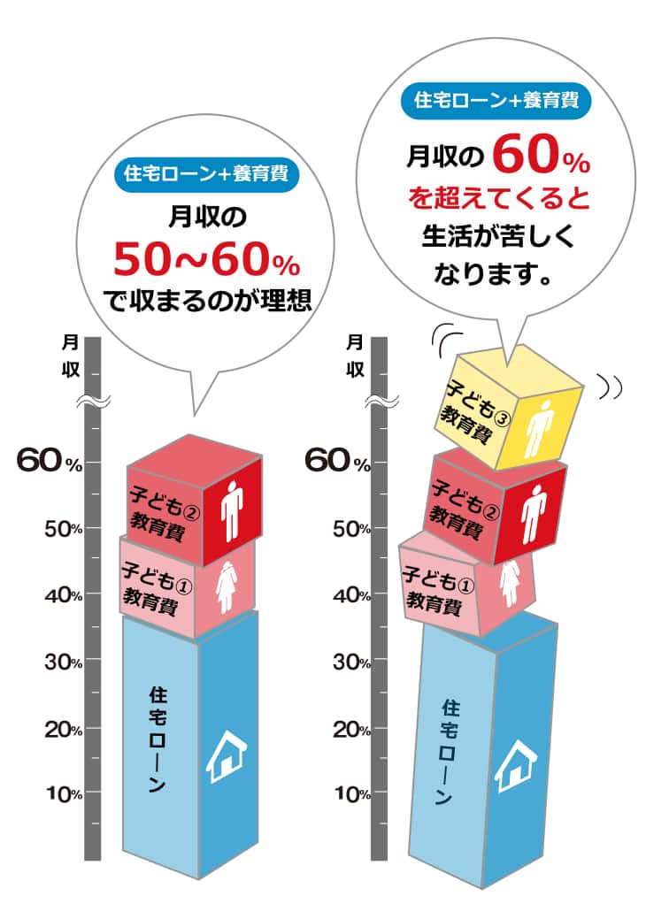 収入に対して「子ども1人/月6万円の教育費+住宅ローン」がどのくらいの割合になるのか考えてみましょう。