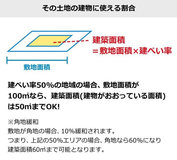 例えば、建ぺい率50%の地域の場合、敷地面積が100㎡なら、建築面積は50㎡まではOKとなります。