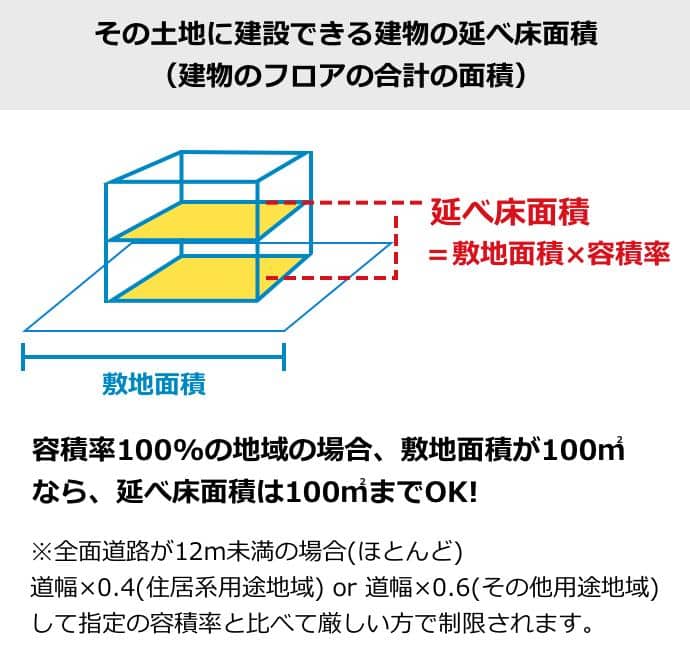 例えば、容積率100%の地域の場合、敷地面積が100㎡なら、延べ床面積は100㎡までOKです。