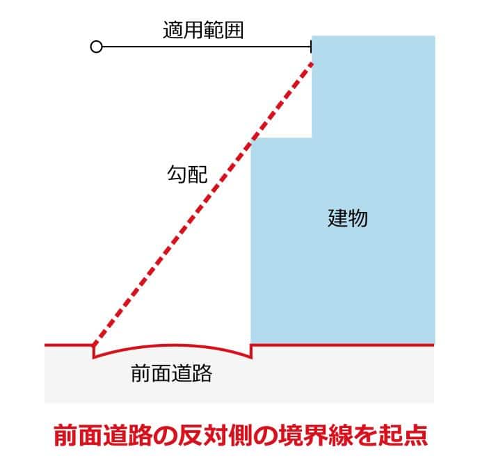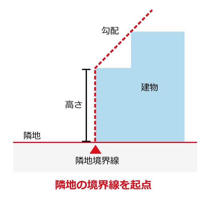 境界線から垂直に5mまたは10m上がった先の高さで一定の勾配を付け、隣地の建物に太陽が当たるように配慮しなければいけません。