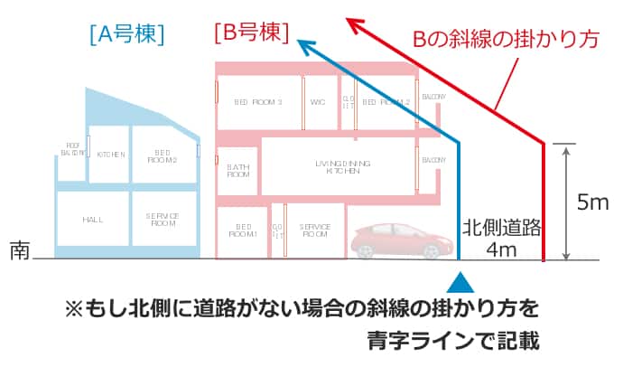 この場合、北道路に接するB号棟は、北側道路を渡った境界線より、5m上がった点から斜線(赤矢印)がかかります。