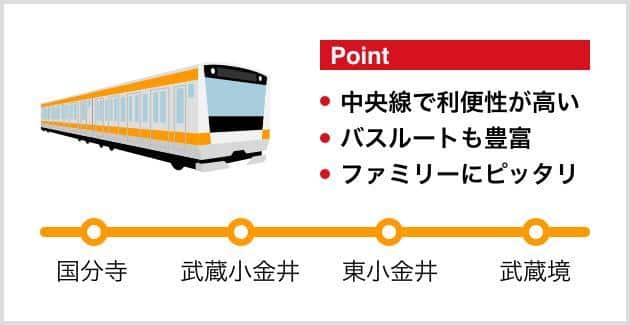 最寄りの東小金井駅、武蔵小金井駅からは、新宿まで乗り換えなしで30分弱。東京駅までも乗り換えなしで40分ですが、三鷹で乗り換えれば、さらに時間も短縮。交通の便がよく、どこへ行くにも便利なことが、小金井の魅力です。