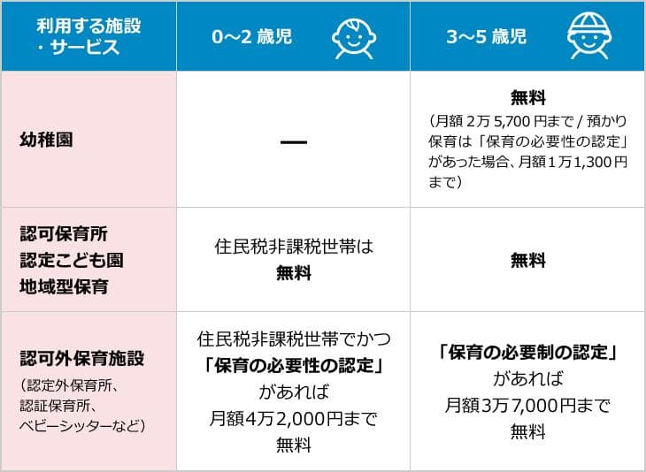 0〜2歳児で無償化の対象となるのは、住民税非課税世帯のみ。一方、3〜5歳児では、上限金額はあるものの幼稚園や認証保育所、ベビーシッターなどの幅広い施設やサービスが対象です。