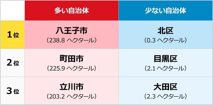 国土交通省の「都市計画区域、市街化区域、地域地区の決定状況」を見ると、各自治体の「生産緑地」の面積をチェックできます。東京都内で「生産緑地」の多い自治体と少ない自治体のベスト3をピックアップしてみました。