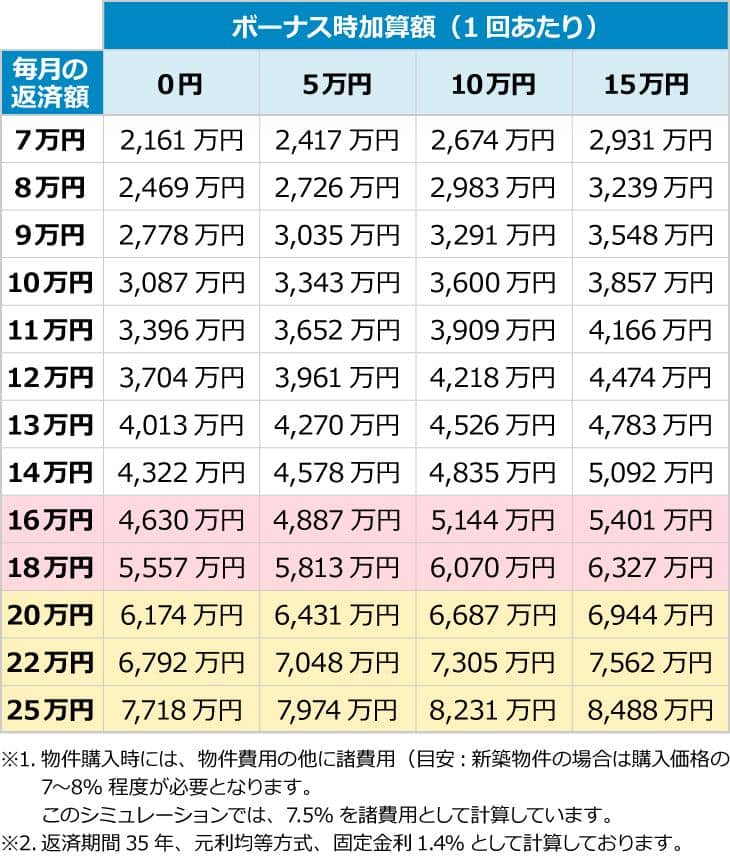 月々に必要なお支払額の目安は、以下のようになっています。
