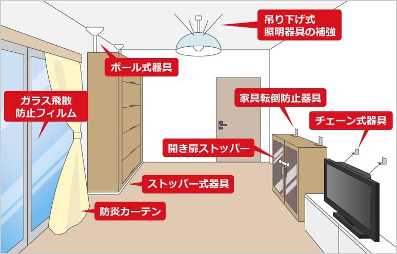 家具の配置、集中収納、家具・家電の転倒や落下防止対策などで、地震に備える。