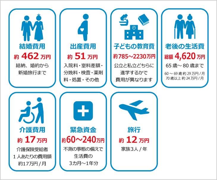 家族の将来を想像してライフプランを立て、主なライフイベントと必要なお金を確認しましょう。マイホーム購入のほか、子どもの教育費など、まとまった出費のおおよその金額を頭に入れておけば、あわてることなく対応できます。