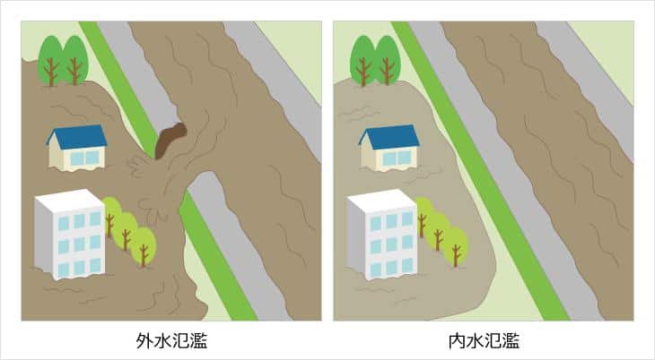 外水氾濫...堤防決壊や越水によるいわゆる洪水。