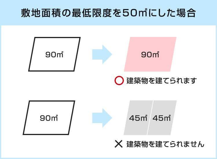 - ※ただし最低限度が指定される(平米規制がかかる)よりも前から45㎡の土地であれば、たとえ50㎡の平米規制が指定された後でも、建築物を建てることができます。