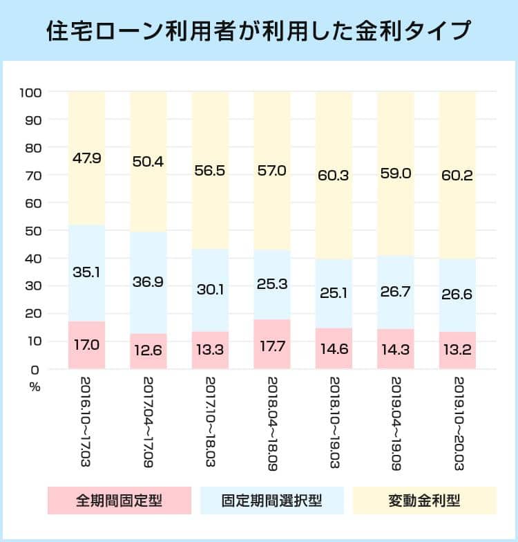 住宅金融支援機構が2020年5月に発表した、「住宅ローン利用者の実態調査」によると、「変動金利型」を選ぶ人が年々増加していることがわかります。