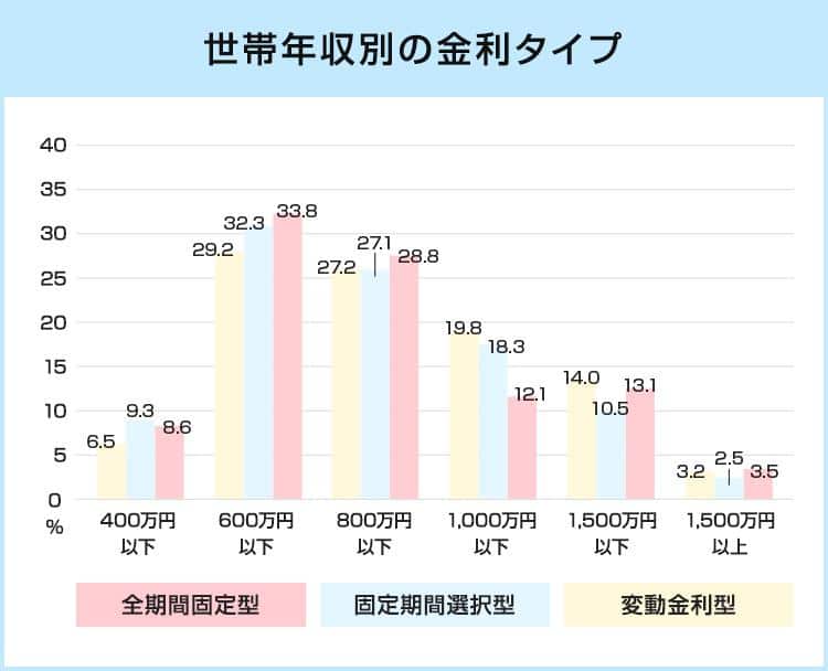 世帯年収で金利タイプを比べてみると、「400万円超~800万円以下」の年収範囲にある世帯が全体の約6割を占めています。年収が上がるにつれて、全期間固定型を選ぶ世帯が減っていくのも興味深いポイントになります。