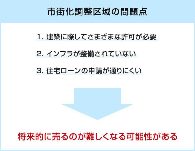 市街化調整区域の土地は利便性に乏しく資産としても考えづらくなるので住宅ローンを組む際も市街化区域とくらべて申請が通りづらくなります。頭金が十分に必要になる場合もでてきたり、これらが原因で売却が難しくなったりする可能性があります。