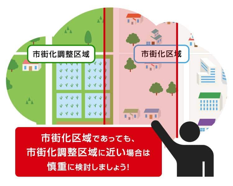 市街化区域内であってもエリアの検討は慎重に行いましょう。たとえば市街化区域であっても市街化調整区域に近いエリアとなると利便性や資産性の面で注意が必要となります。