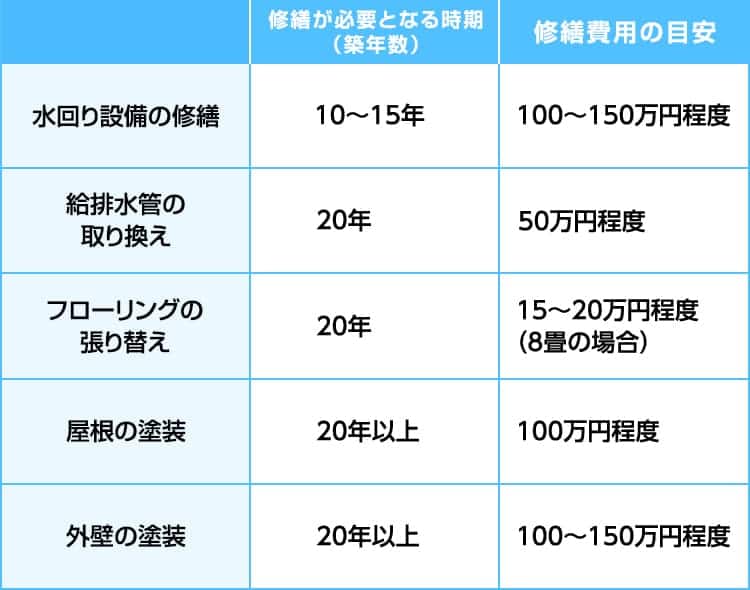 修繕が必要となる箇所や費用の目安について、築年数ごとにまとめると以下のようになります。