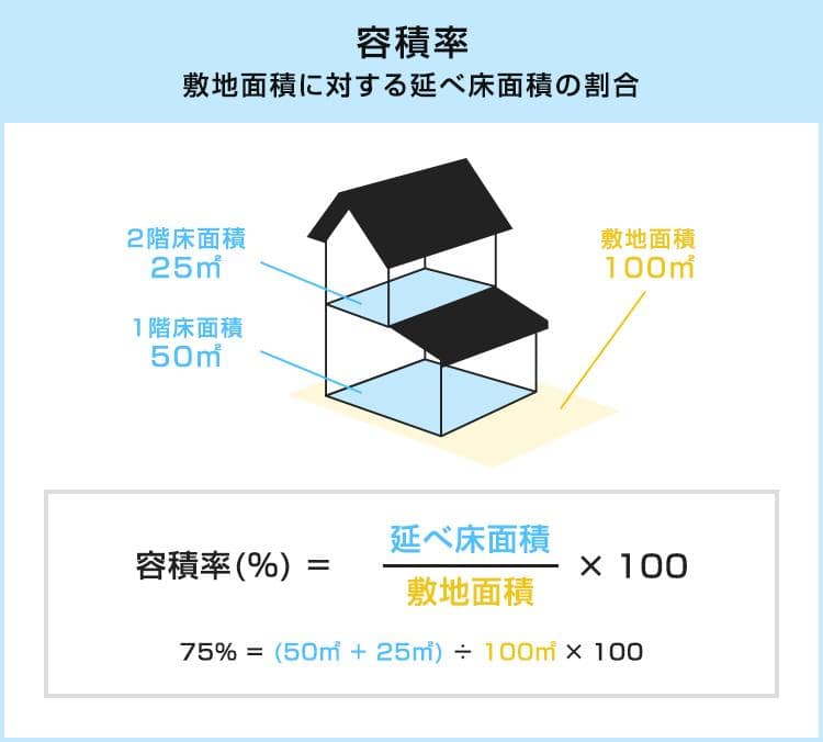 容積率とは「土地に対して建築できる延べ床面積の割合」のことです。延べ床面積は1階部分だけでなく2階や3階といった「各階の面積も含んだ広さ」を指しているので、2階建て以上の戸建てを建てるときには注意しておきましょう。