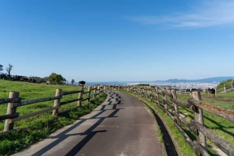 油山牧場は、福岡市南区の油山山麓にあり、福岡市の中心部から車で約30分に位置します。