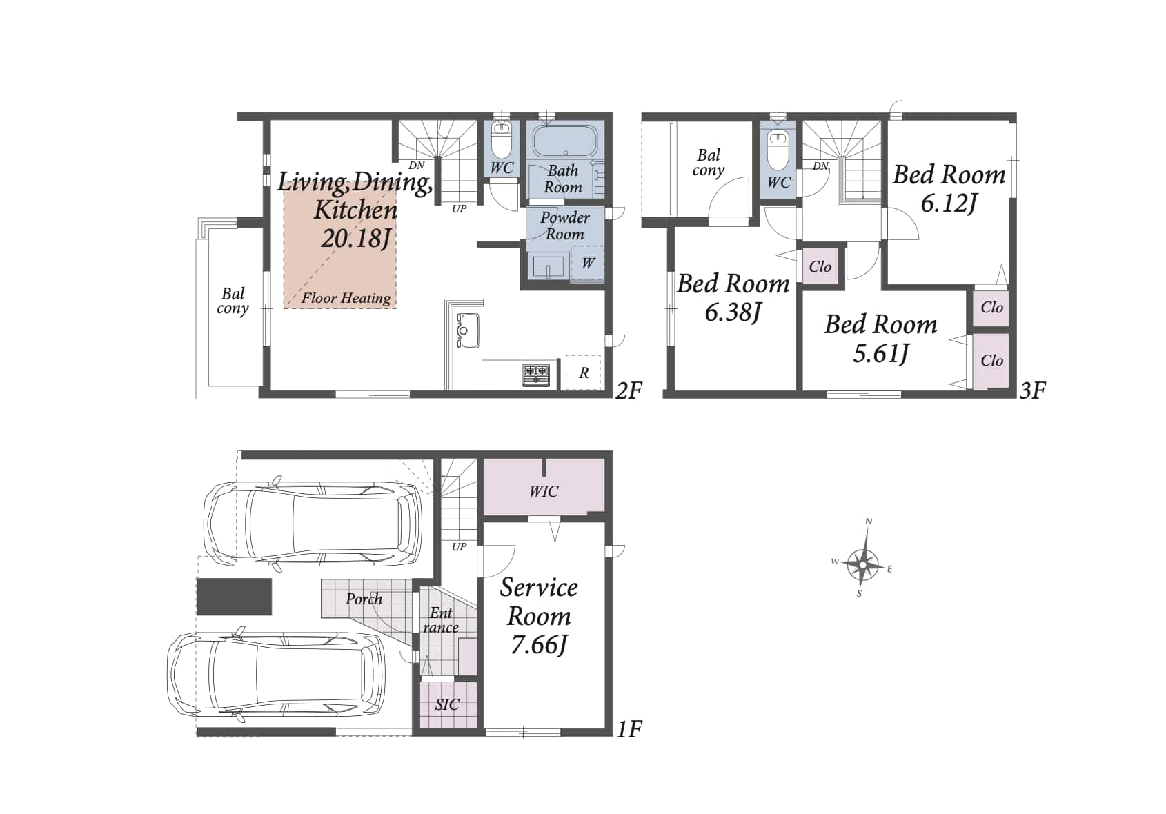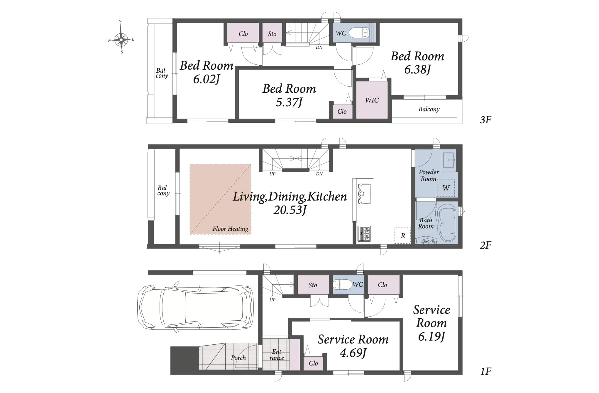 1階のサービスルームや3階の各部屋にはもちろん、階段横のスペースなども倉庫として利用することが可能となっています。