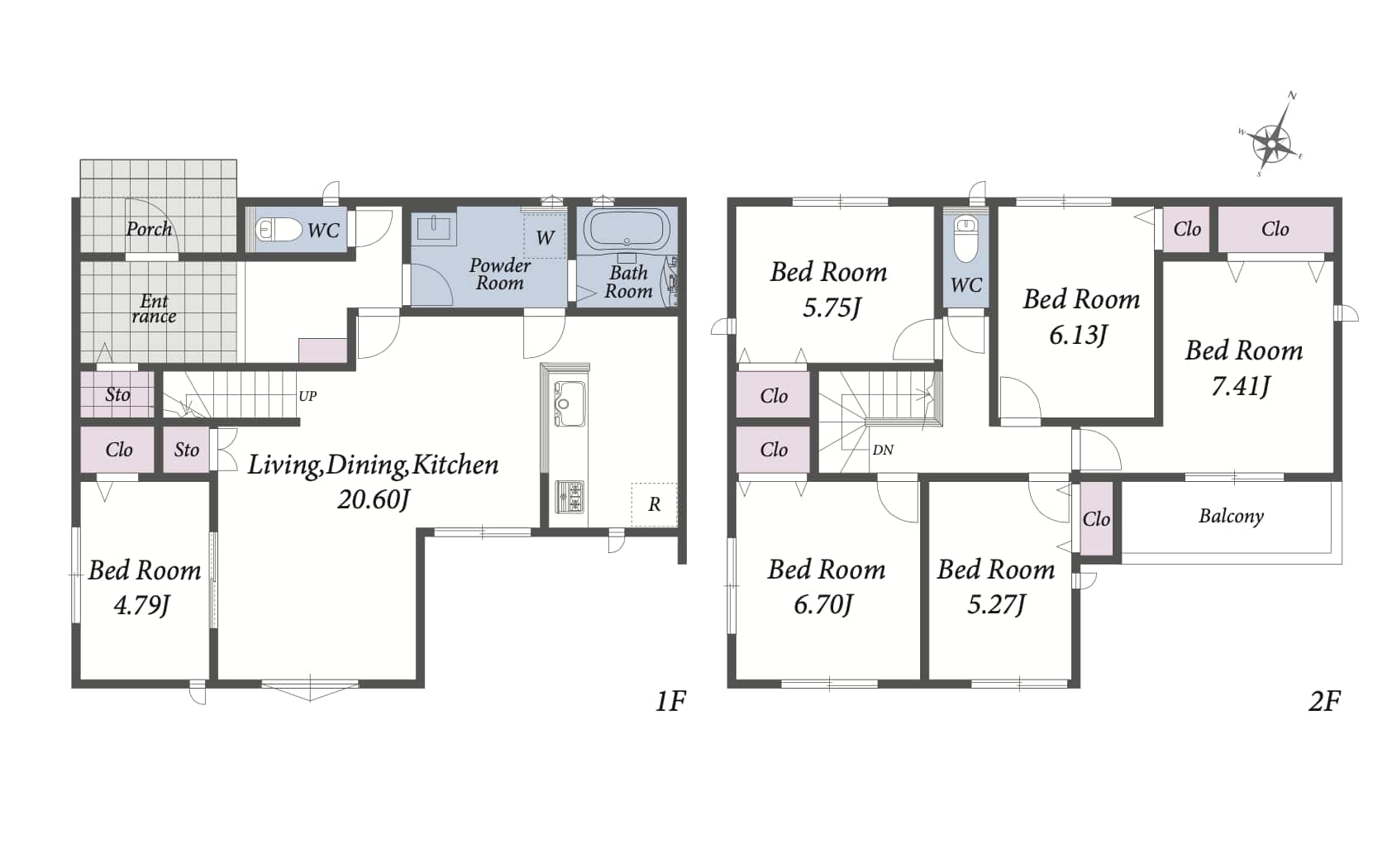 2階の独立した5つの部屋に加え、1階のリビング横にもベッドルームが用意されているため、3〜6人家族であれば各々の部屋を設けることが可能です。