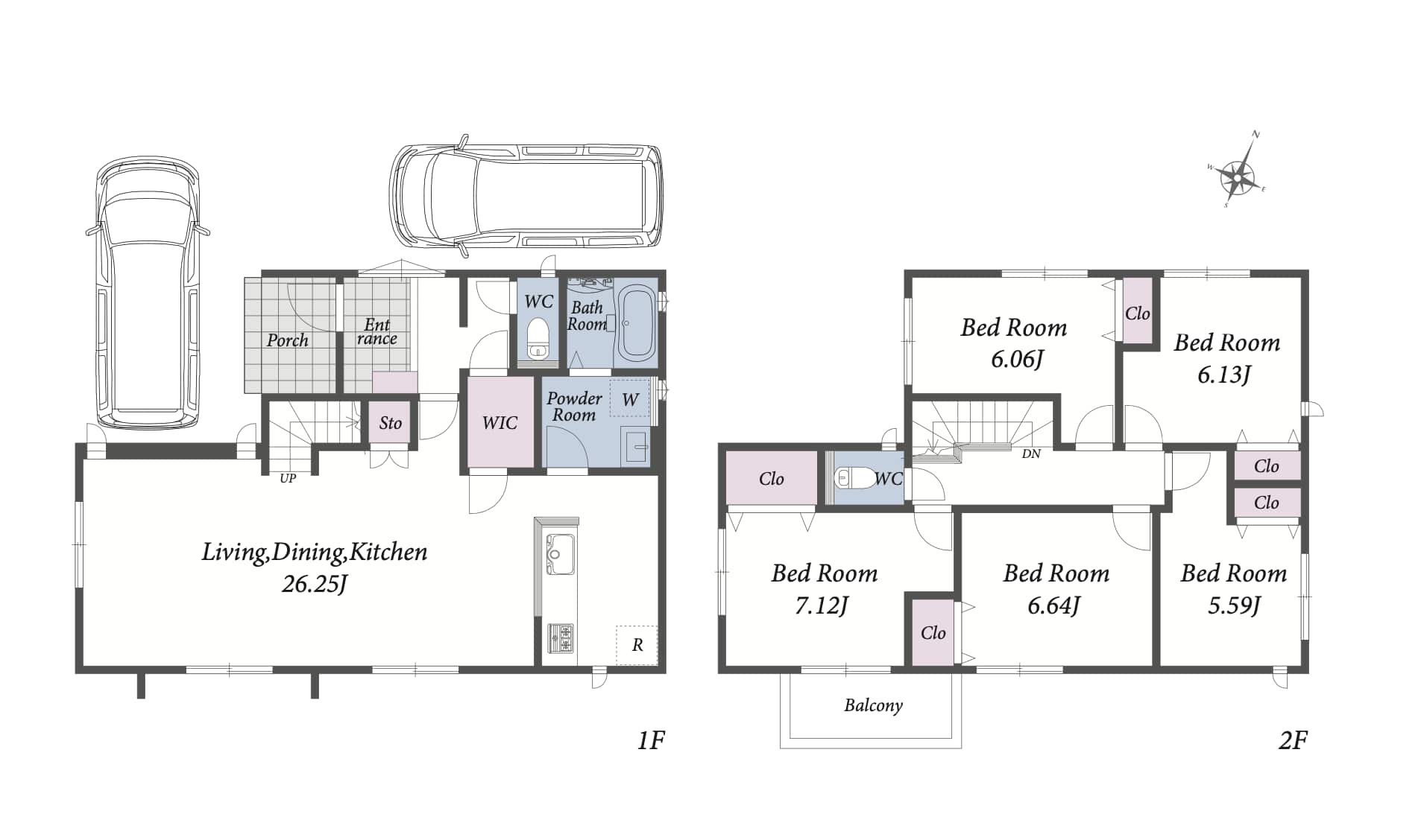 1階には広々としたリビング、2階には寝室や書斎として利用可能な5〜7畳の5つの部屋があります。