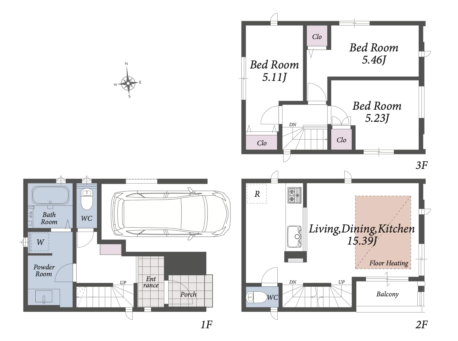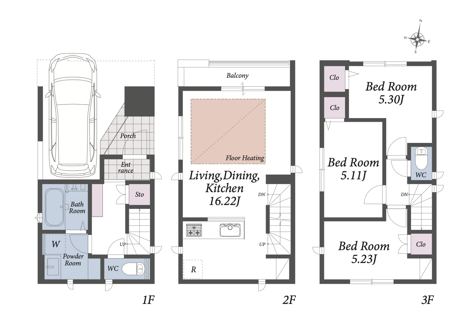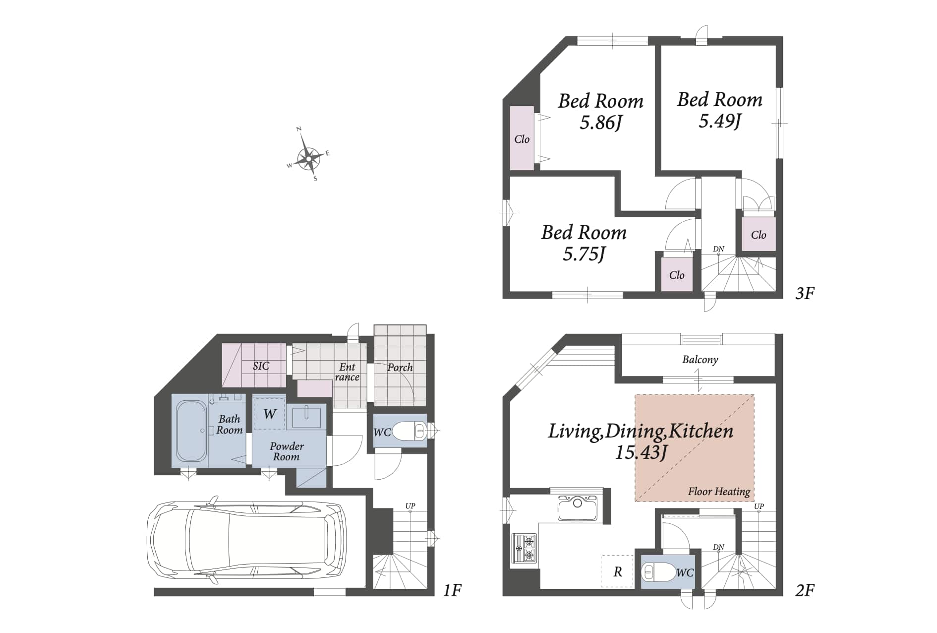 3階建てで、1階に駐車場や浴室、2階にリビング、3階に個室を3部屋設けた間取りです。