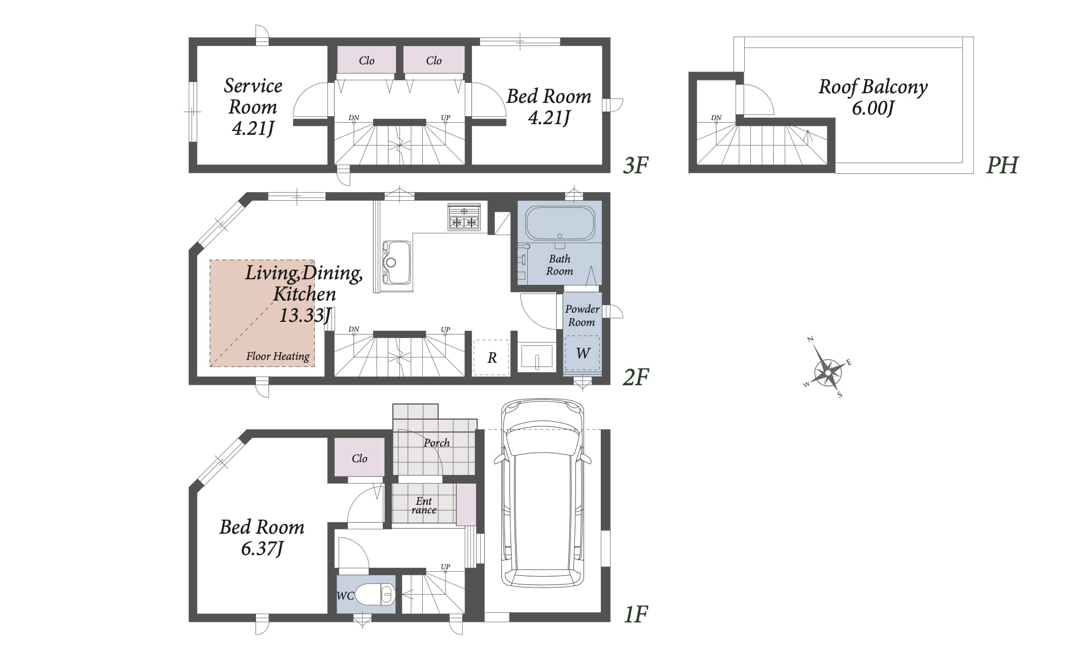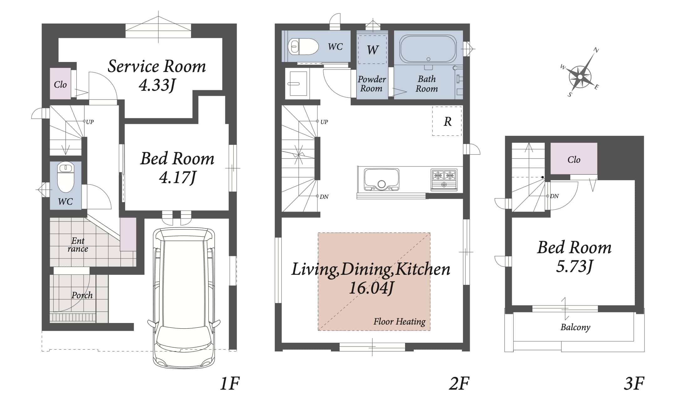 2階に約17畳のリビング兼キッチン、そのほかに3部屋を設けた間取りです。