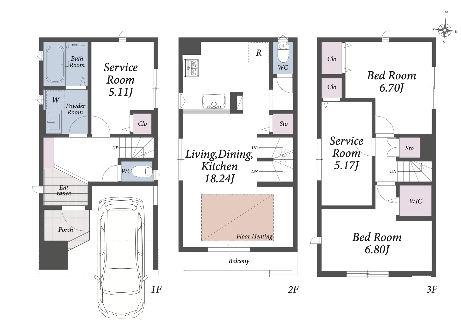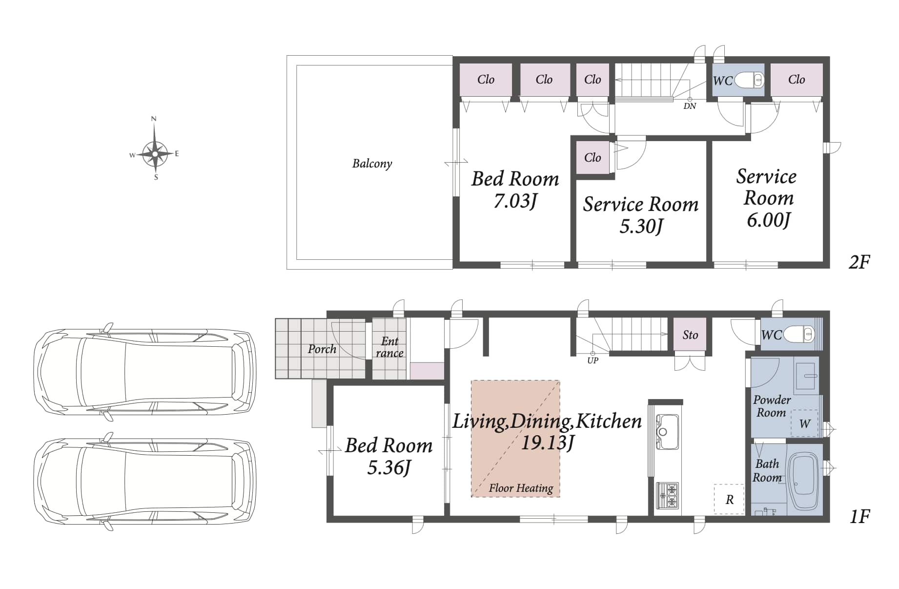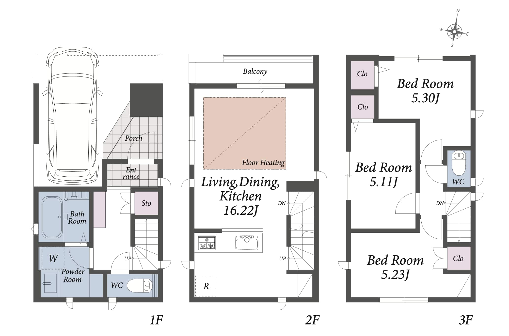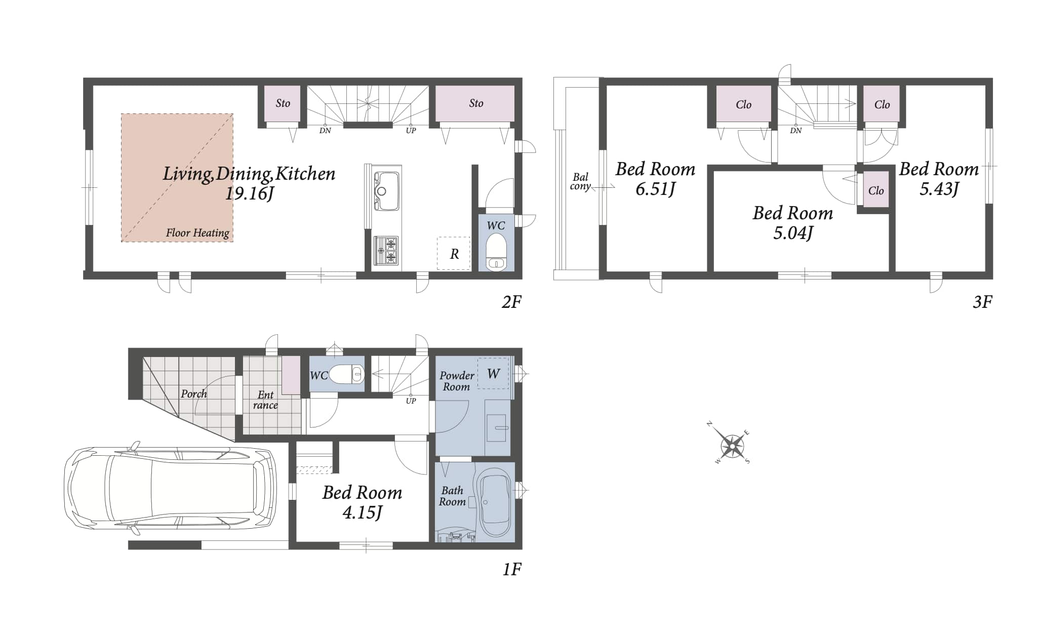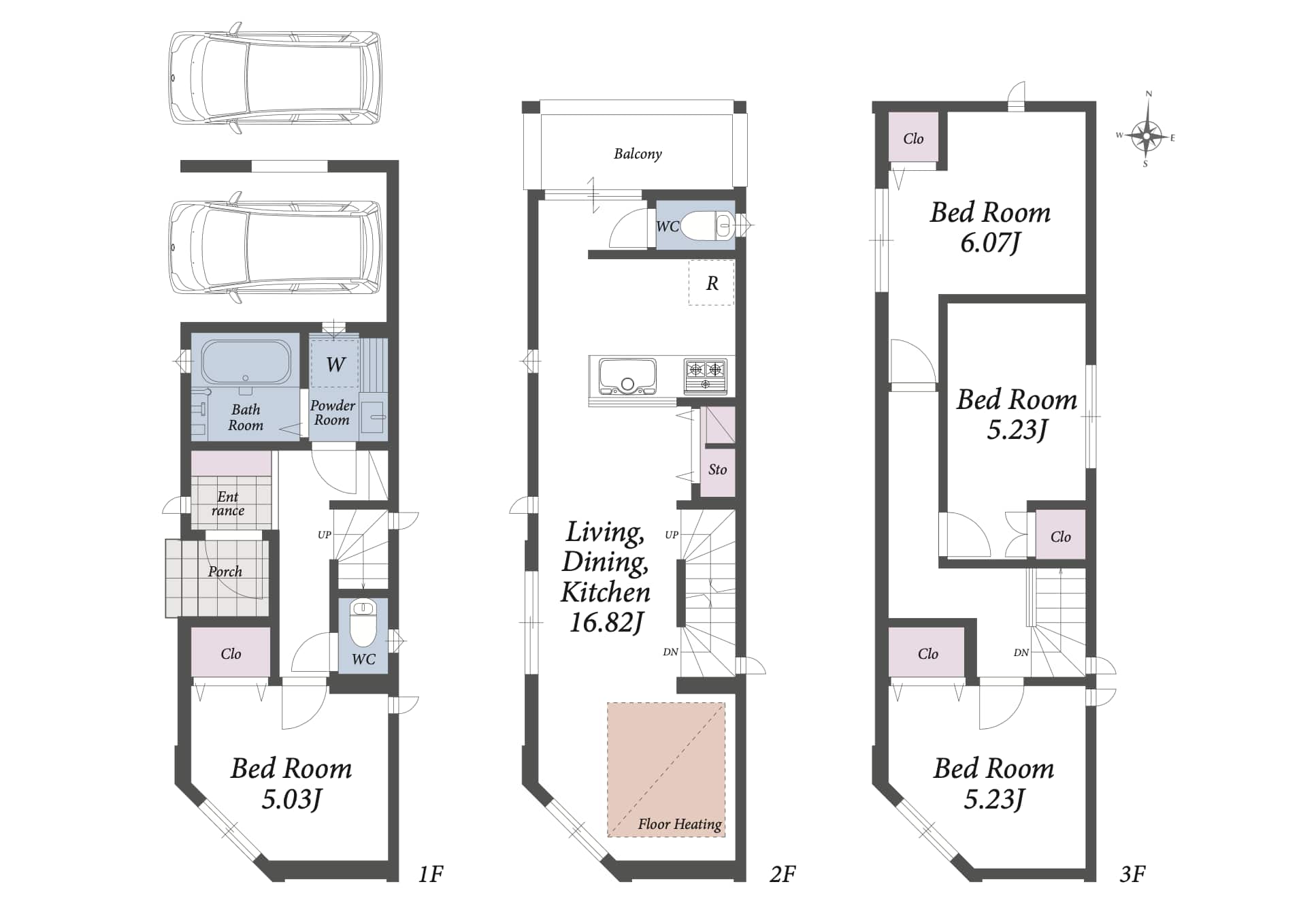 3階建てで、屋内と屋外に1台ずつ計2台の車を停められる間取りです。
