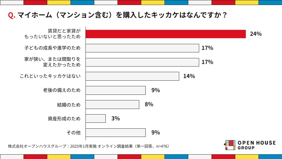 その結果、最も多かった理由は 「賃貸だと家賃がもったいないと思ったため」 で、全体の24%を占めました。次いで、「家が狭い、または間取りを変えたかったため」(17%)、「子どもの成長や進学のため」(17%)と続きました。
