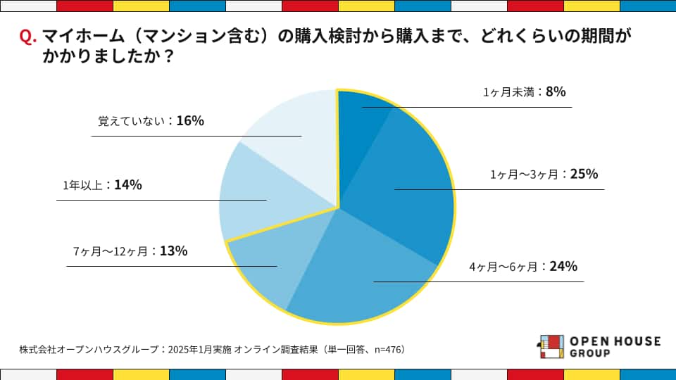 また、住宅購入を決めるまでの期間についても調査を行ったところ、「1年以内に決断した」 という回答が全体の70%を占めており、住宅購入の意思決定は比較的スピーディーに行われていることが分かりました。