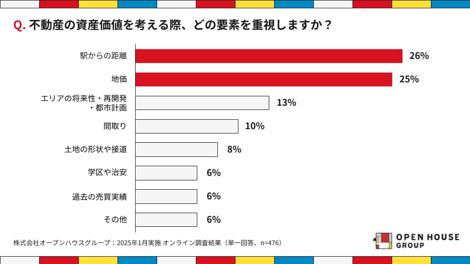 本調査結果では「駅からの距離」を重視すると答えた人が26%、「地価」を重視すると答えた人が25%にのぼり、立地を重視する人が半数以上という結果になりました。