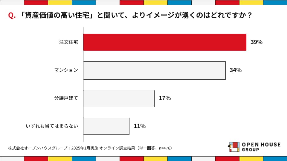 その結果、「注文住宅」が最も資産価値が高いと想起し、「分譲戸建て」が最も資産価値が低いと想起することがわかりました。