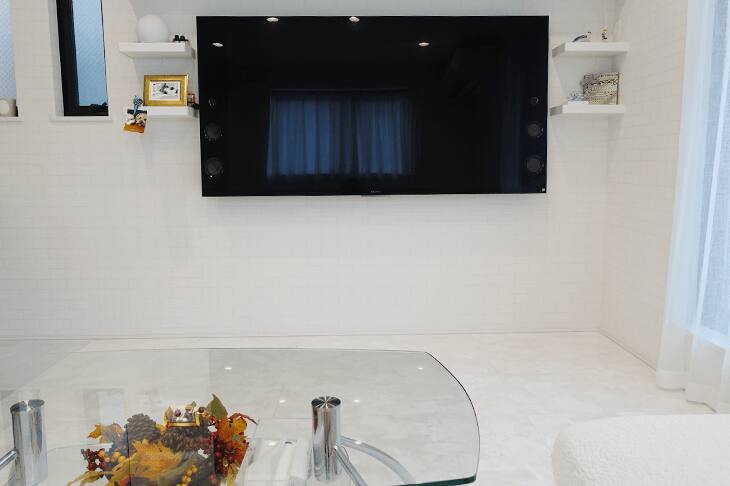 全部こだわったんですけど、まずはタイルにしたリビングの床ですね。その床も含めて、リビング全体のカラーは白を基調にして、家電などは黒で統一しました。あとはテレビ周りですね。みんな映画が好きなので大きなスクリーンが収まるようにして、周りに飾り棚も入れてもらいました。(ご主人様)