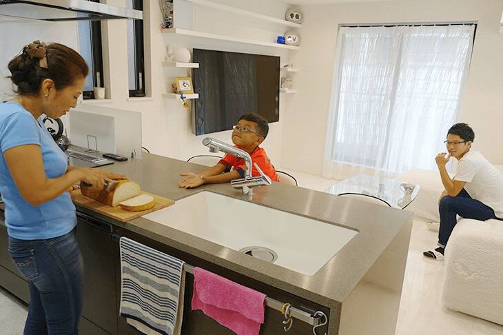 私のこだわりはキッチンです。とにかく家族が見えるところで料理をしたかったので、対面式にしました。そして「働きながらも3品出す」というのが私のこだわりなんですが、やっぱり時間の制限はあるので、時短のために食洗機を付けてもらいました。このキッチンは魚を焼いてもニオイもないですし、お手入れもしやすいので、本当にこれにして良かったですよ。料理をするのが楽しい!(奥様)