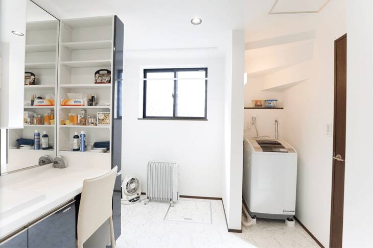 1階の洗面所は、ランドリースペースを兼ねているのですが、4畳半ほどの広さに。1人暮らしの家では通常は採用しない、贅沢なつくりになっていますが、私の家にとっては必要不可欠なもの。ときには常識を疑って、自分にとって何が必要かを考えることが大事です。