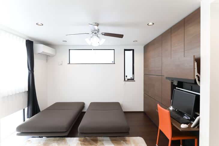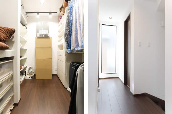 家の設計や内装でこだわったのは、来客が多いこともあり、なるべく家主の気配を感じさせないこと。そのために、扉の付いている壁面収納や大容量のウォークインクローゼット(WIC)を備えつけました。生活感の出るものを排除して、普段過ごす空間はすっきりと。WICには、洋服や旅行用のスーツケース、季節家電や布団などを収納していますが、まだまだ余裕があります。