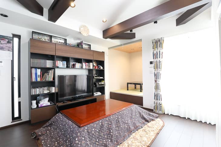家の中のどの空間も気に入っていますが、あえて一番を選ぶとしたら、過ごす時間が長いリビングですね。隅には小上がりのスペースを作りました。そこの壁紙には和テイストのものを選んで、和モダンな雰囲気に。ちょっとしたスペースですが、昼寝をするのにちょうど良いですし、下は収納スペースになっているので便利に使えます。
