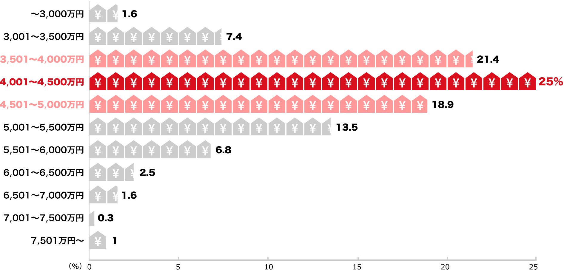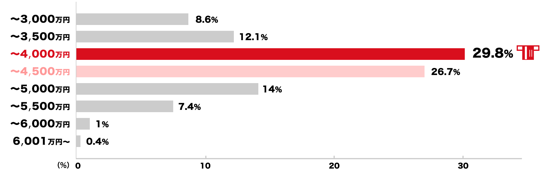 「4,000万円台の前半」が25%と最も多いという結果に。次いでその前後の価格帯が多く、「5,000万円以下」が全体の7割以上を占めています。