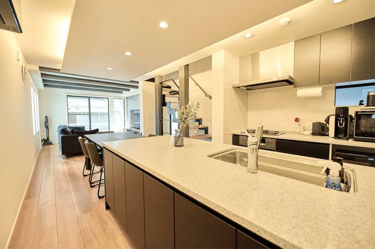 キッチンは当初のL型からⅡ型に変更しました。間取りが細長いタイプなので、部屋が広く見えるようにと設計士さんから提案をいただいたものです。1階に用意した和室は寝室としての用途以外に、趣味のヨガや夫のリモートワークでも使えるので非常に重宝しています。(奥様)