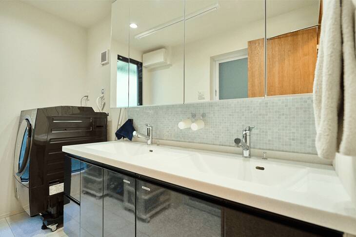 元々の間取りでは洗面とお風呂場が1階にあったのですが、家族が使うものは同じ階にしたいと思い、お風呂場をLDKと同じ2階にまとめました。洗面台を2ホールにしたので朝の準備がスムーズなのもいいですね。(ご主人様)