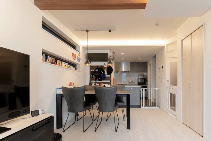 リビングはできるだけ明るくて開放的な空間にしたいとお願いしました。床材はナチュラルで明るいものとし、照明は設計の方のご提案で間接照明を取り入れました。ここにもできるだけ家具は置きたくなかったので、テレビ台は作り付けに。圧迫感のない、快適なリビングができました。(ご主人様)