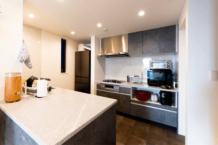 キッチンは当初、L字型を考えていましたが、設計の方の提案でセパレートのニの字型のレイアウトに変更しました。これが大正解。シンク台からコンロ台への移動は体を反転させるだけですし、間に広い作業スペースも確保できました。訪ねてきた実家の母も「広くてうらやましい」と驚いています。床材は、これもご提案に合わせてタイルにしました。油はねもそうですが、これから息子がいたずらしたりこぼしたりしても簡単に拭き取れます。キッチンの壁にマグネットをつけられるのも、ちょっとした工夫ですが意外と便利です。(奥様)