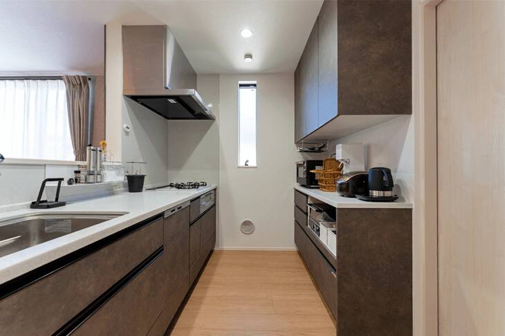 キッチンは当初L字型を考えていました。しかし設計の段階でL字型にするとデッドスペースができてしまい、空間が狭くなってしまってもったいないからと、Ⅱ型への変更をご提案いただきました。Ⅱ型ということで特に使い勝手に不満はありません。キッチンからはリビング全体が見渡せるので、とても開放感があります。(奥様)
